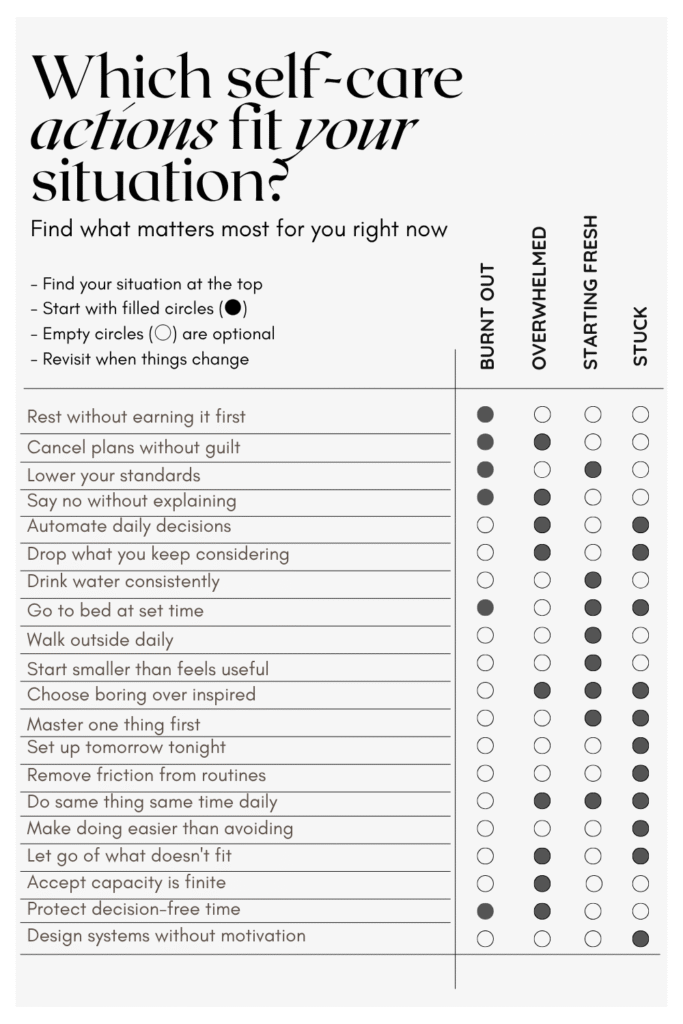 What helps: rest without justifying it. Cancelling plans without elaborate explanations. Lowering your standards until they’re embarrassingly low. Choosing survival mode deliberately instead of pretending you’re fine.