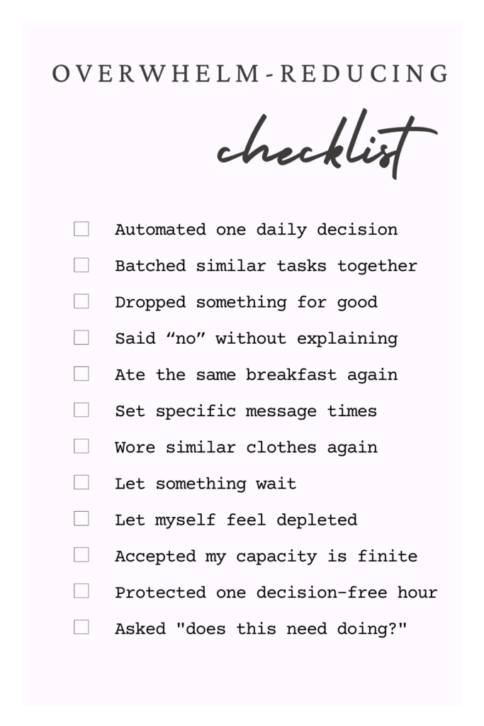 What helps when you’re burnt out won’t work here. You don’t need more rest. You need fewer decisions. (Not sure which situation you’re in? Read the main guide.)