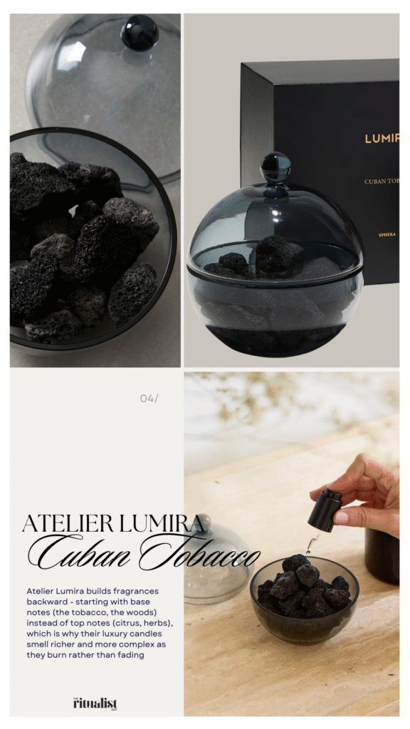 What makes it different: The Sphera is a hand-blown smoky black glass sphere filled with natural lava rocks. You add drops of the 15ml Cuban Tobacco Essenza oil to the rocks, which absorb and slowly release the fragrance over time. It’s not a candle (nothing burns), not a diffuser (no reeds or water), but something closer to a sculptural incense holder—except the scent comes from oil-soaked volcanic rock.