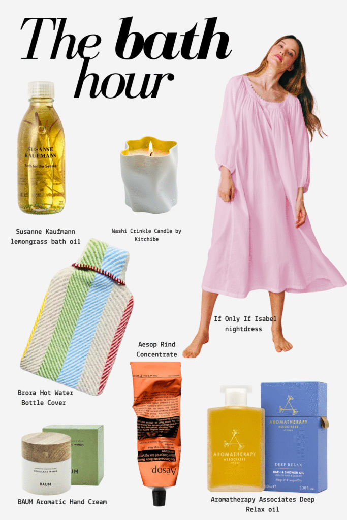 The Bath: Susanne Kaufmann lemongrass bath oil (£55 / ca. USD $70) or Aromatherapy Associates Deep Relax (£48 / ca. USD $61) BAUM Aromatic Room Spray (AUD $59 / ca. USD $40) – for forest-bathing atmosphere Brora hot water bottle cover (AUD $105 / ca. USD $70) – for warming nightclothes