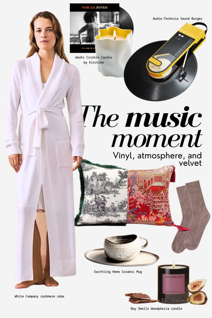 The candle gets lit first. The Washi Crinkle Candle from Kitchibe (ca. USD $55) on the side table next to the velvet chair. It smells like freshly hand-crafted Japanese paper from mountain mills surrounded by cedar forests – not woodsmoke exactly, more like the memory of trees. The ceramic holder by Makoto Komatsu is beautiful enough that you’ll keep it long after the 40 hours of burn time are done.