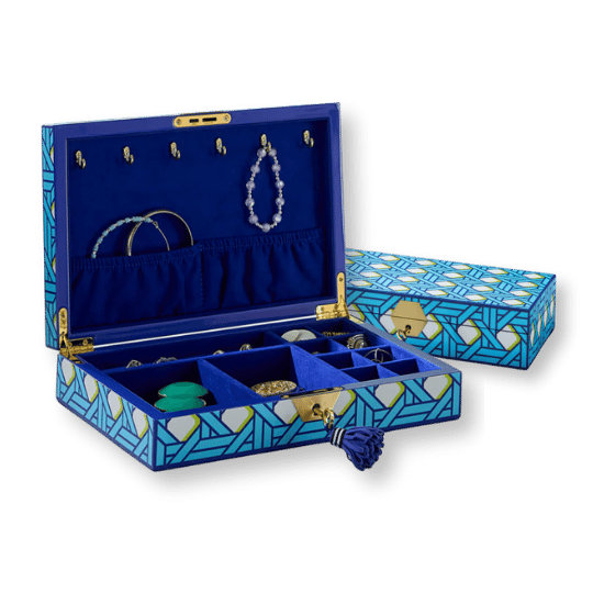 Earrings, rings and necklaces off the bedside table, into velvet compartments. One less surface for your brain to scan.