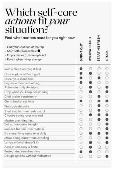 Here's what nobody tells you: a sustainable self-care lifestyle isn't built by copying someone else's Instagram grid. What helps when you're burnt out is different from what helps when you're drowning in decisions. What works when you're starting fresh won't work when you've already tried everything twice and given up both times.