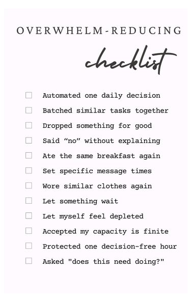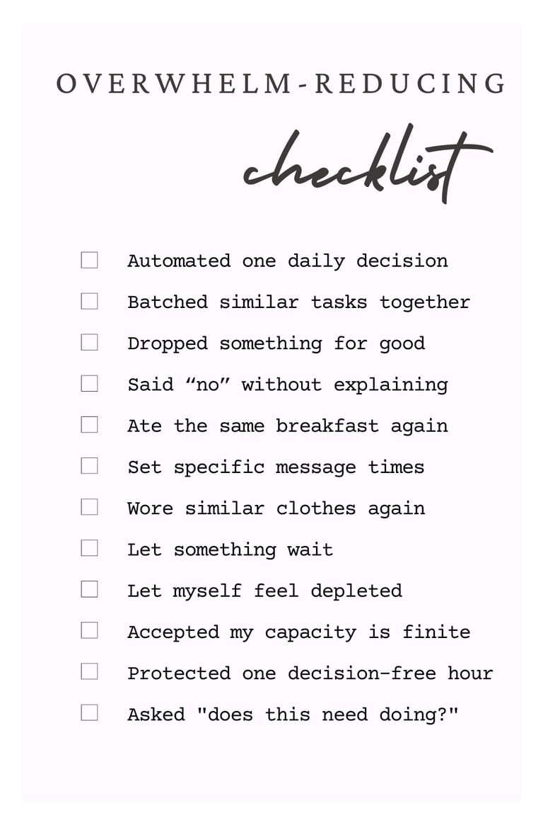 Batch the decisions you can't remove. Respond to messages once daily instead of constantly. Check email twice instead of leaving the tab open. Have one day for appointments instead of scattering them through the week.