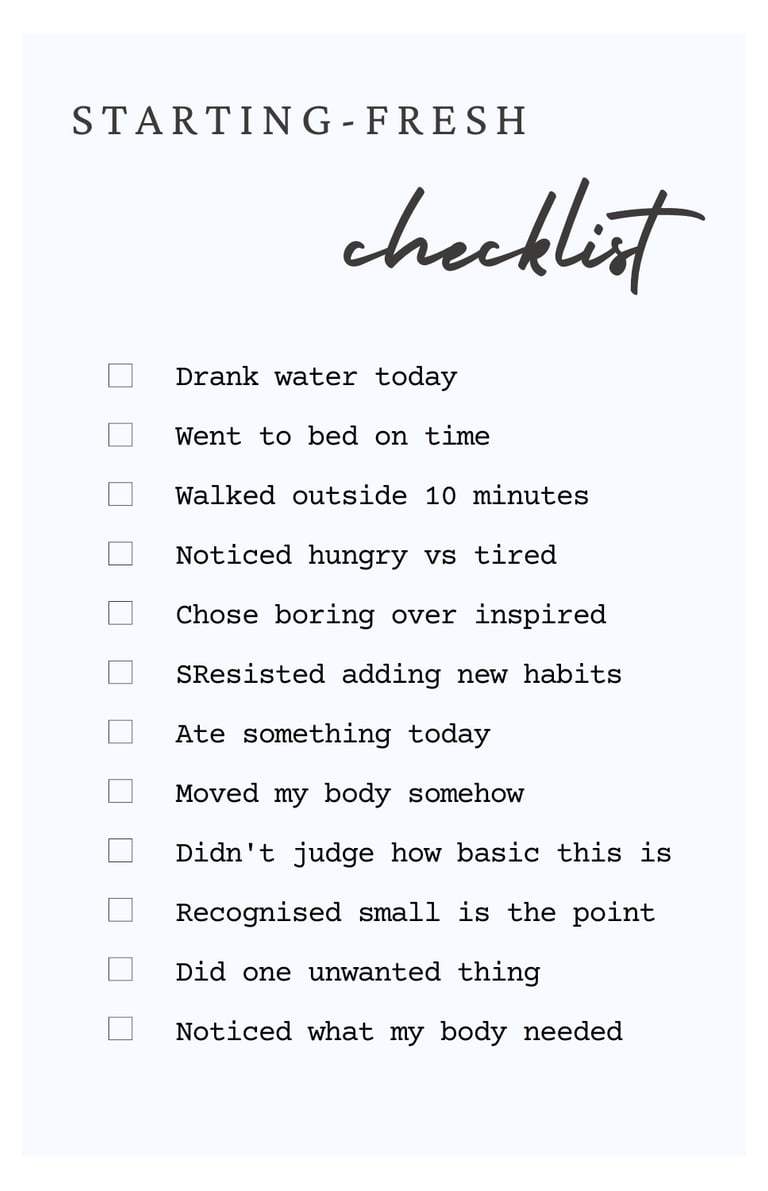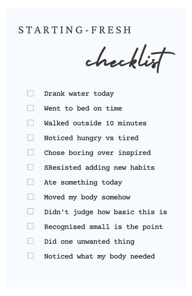 These feel pointless because they're small. They're supposed to be small. You're not building transformation. You're building the foundation for noticing what you need. You can't recognise hunger versus thirst versus tiredness until you're hydrated, rested, and moving occasionally.